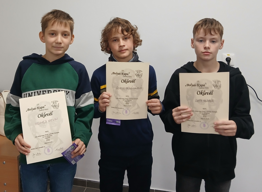 November 30-án a „Bolyai-Kupa” Térségi Fejszámoló Versenyen jártunk diákjainkkal. A következő eredmények születtek: 5-6. évfolyamon egyéniben Quell Zénó 4. helyen, Heincz Kevin az 5. helyen végzett. Csapatban 3. helyezést ért el a Quell Zénó, Heincz Kevin, Lutz Olivér összeállítású csapatunk.